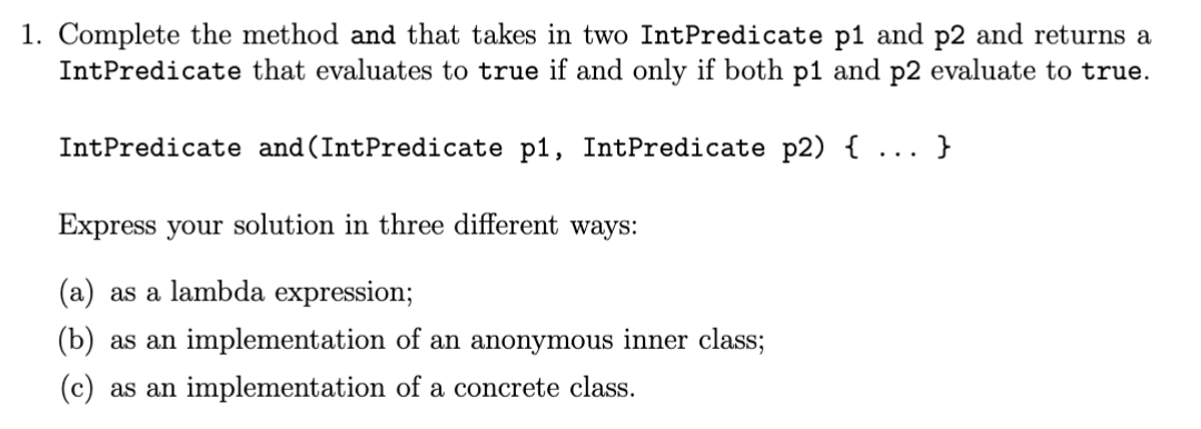 public IntPredicate and(IntPredicate p1, IntPredicaate p2) {