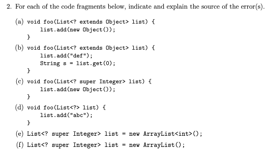 (a) .add adds elements into a list. List<? extends Object> blocks you from adding anything because it’s so generic. You can’t add anything inside because you might put the wrong thing inside. Why can’t you add Object? Because at run time you’re not sure what list actually is.